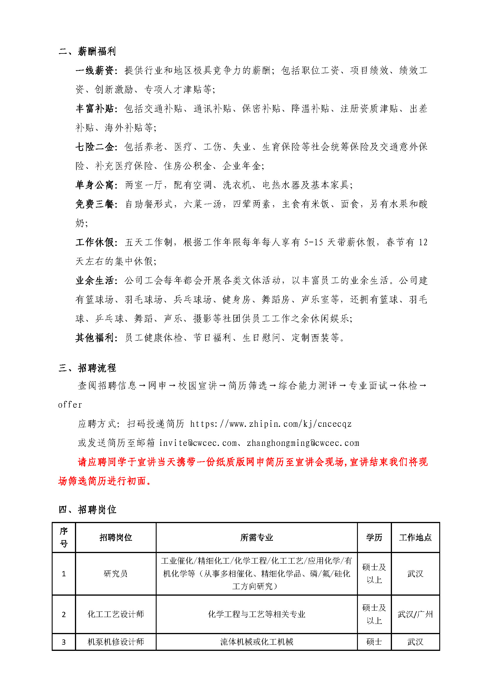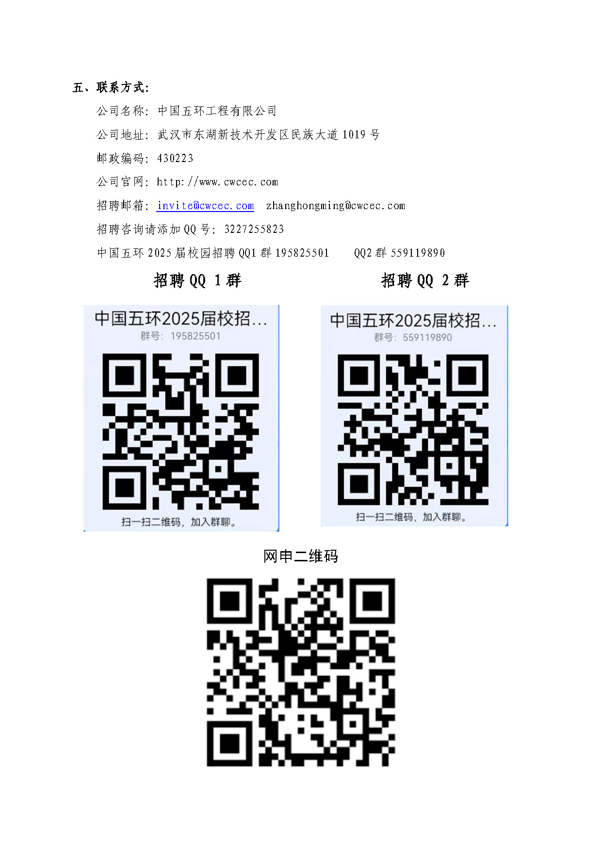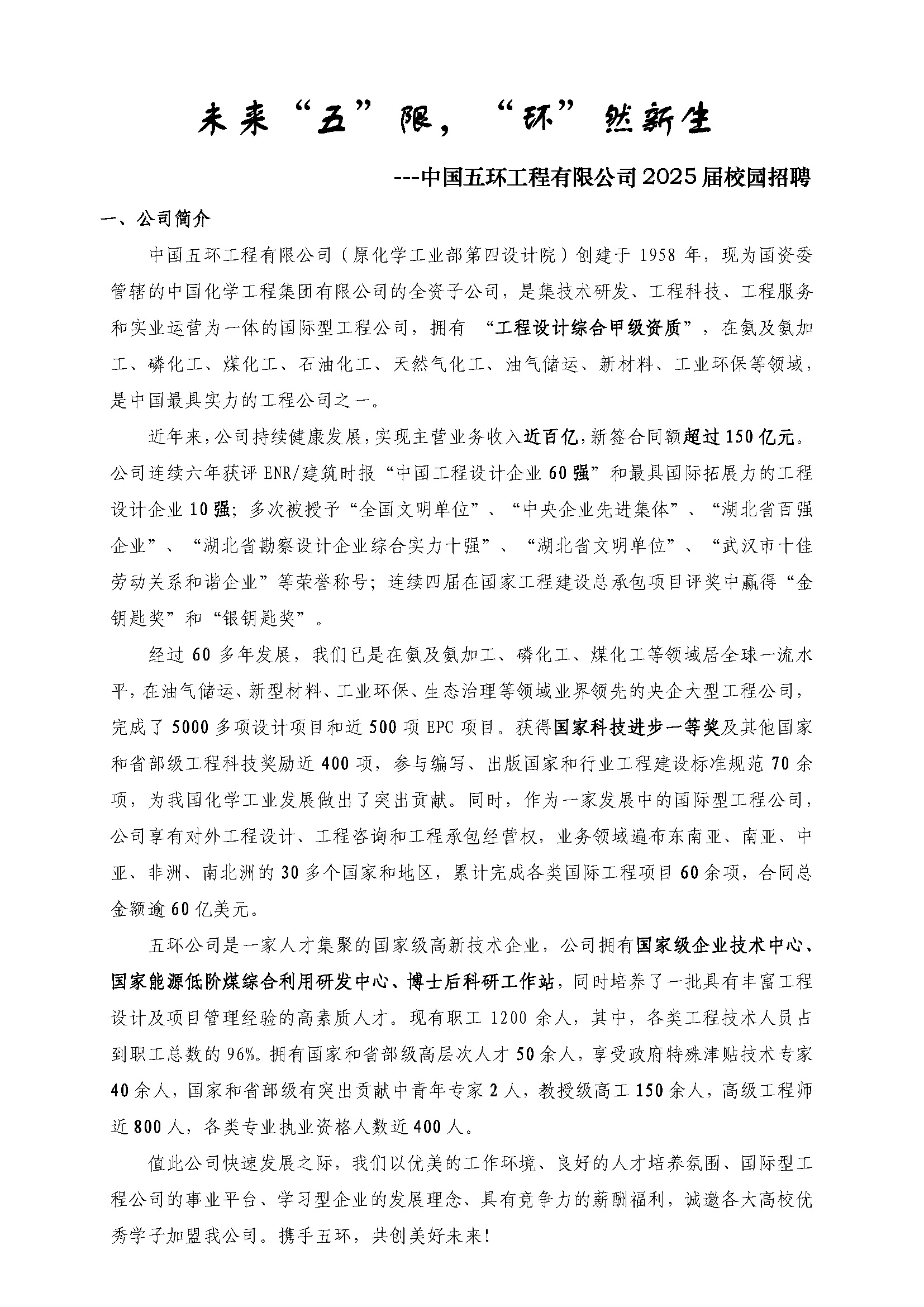值此公司快速发展之际,我们以优美的工作环境、良好的人才培养氛围、国际型工程公司的事业平台、学习型企业的发展理念、具有竞争力的薪酬福利,诚邀各大高校优秀学子加盟我公司。携手五环,共创美好未来!