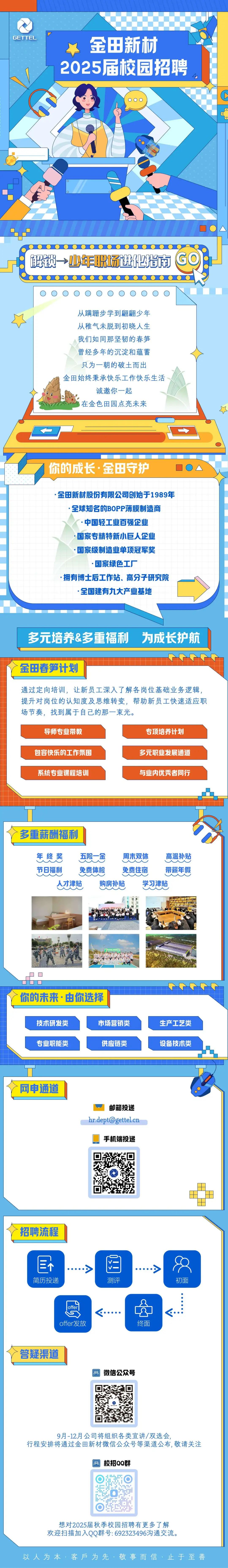 安徽金田高新材料股份有限公司(简称金田新材),是一家专注于软包装薄膜基材研发、生产与销售的高新技术企业。拥有多种功能性薄膜产品,广泛应用于食品、医药、纺织服装、烟草、白酒、图书印刷等下游终端行业,是印刷复合、激光防伪、商品标签、食品包装、家居装饰、电子产品保护的首选材料,是世界BOPP薄膜行业知名企业。