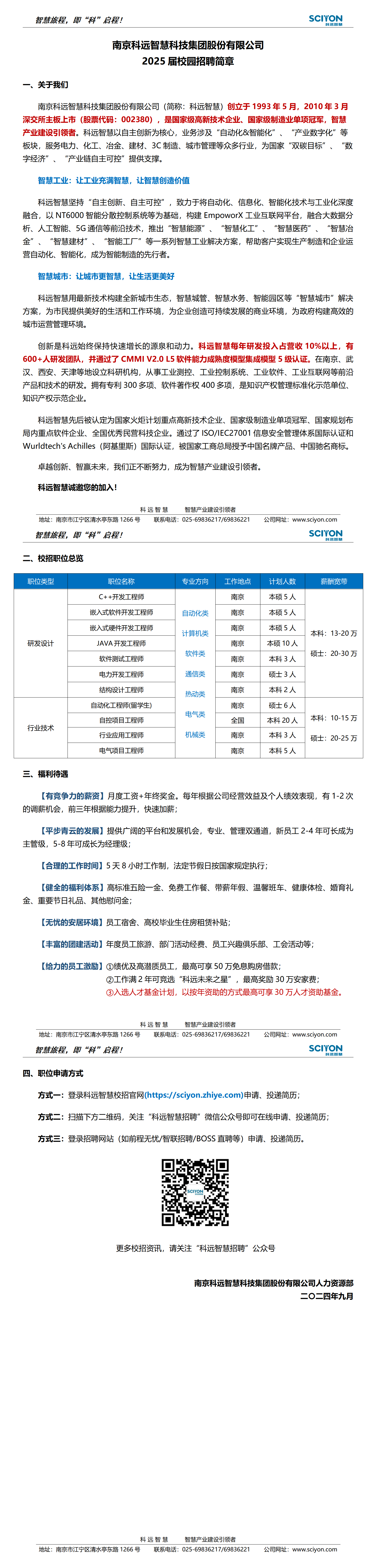 南京科远智慧科技集团股份有限公司创立于1993年5月,2010年深交所上市(股票代码:002380),公司规模1500多名员工,80%本科及以上学历。是中国领先的自动化、信息化、智能化技术、产品、解决方案供应商,全方位智慧产业领导者,业务涉及“智慧工业”、“智慧城市”、“智慧能源”三大板块。 智慧工业:让工业充满智慧、让智慧创造价值 科远智慧基于EmpoworX工业互联网平台的智慧电厂、智慧化工、智慧冶金、智慧建材、智能工厂等系列智慧工业解决方案,致力于帮助客户迈向智能制造新时代。 智慧城市:让城市更智慧、让生活更美好 科远智慧将先进的自动化、信息化、智能化技术应用于城市建设和管理,推出智慧城管、智慧水务/水利、智慧园区等智慧城市解决方案,助力实现让城市更智慧、让生活更美好。 智慧能源:构建绿色、智慧、互联的能源新未来 科远通过构建能源综合管理和运营服务平台,实现冷、热、电、气、水多种能源的智能生产、智慧管控、高效利用,投资建设沛县、安岳等智慧能源示范项目,全力“构建绿色、智慧、互联的能源新未来”。 创新是科远智慧始终保持快速增长的源泉和动力。科远智慧在南京、武汉、西安等地设立了技术研究院等科研机构,从事人工智能、大数据分析、故障诊断与分析等前沿技术的研究和应用。拥有各项专利200多项、软件著作权300多项。通过了CMMI-5认证,是国内为数不多的拥有最高标准化和规范化软件开发能力的企业。