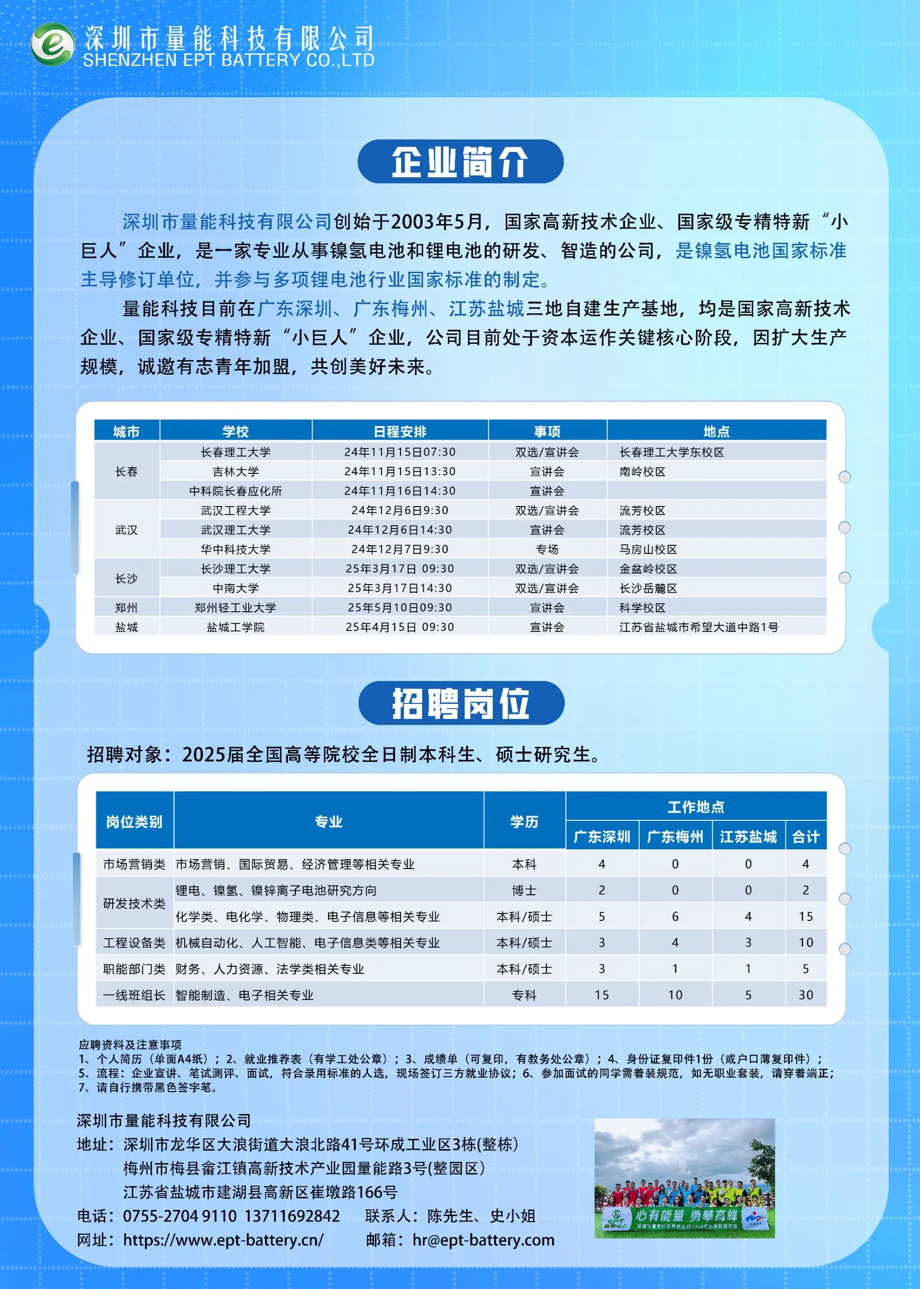 量能科技目前在深圳、广东梅州、江苏盐城三地自建生产基地,均是国家高新技术企业、国家级专精特新“小巨人”企业,公司目前处于资本运作关键核心阶段,因扩大生产规模,诚邀有志青年加盟,共创美好未来。