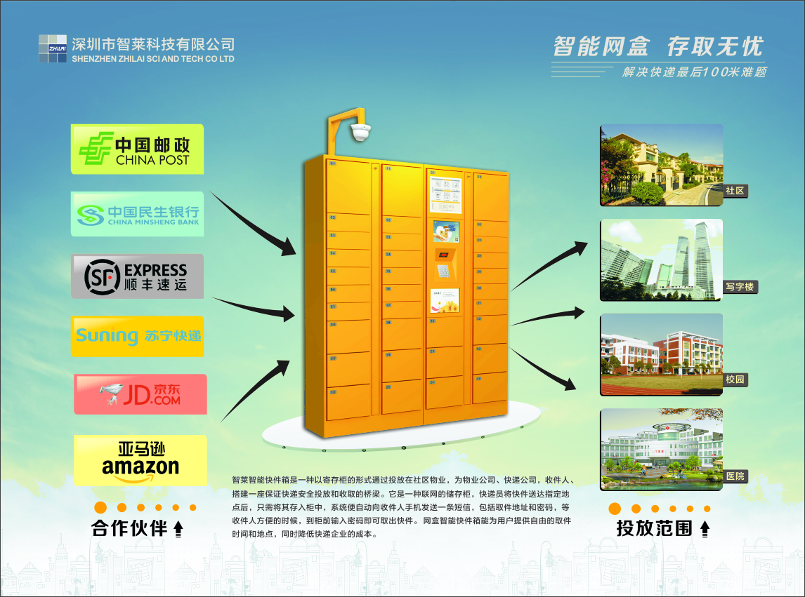 智莱科技是亚马逊快递储物柜(Amazon Locker)的唯一合作开发及制造商。智莱科技是中国邮政储蓄银行湖北省分行智能快递柜、中国民生银行智能快递柜、北京邮政数字报刊亭智能包裹柜、郑州市邮政局智能包裹柜、京东商城智能快递柜中标企业。