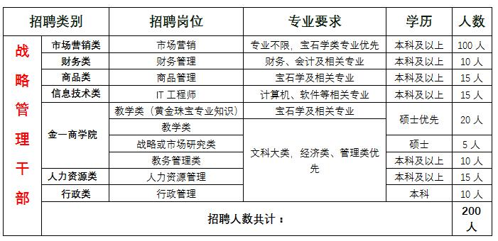一、企业简介: 金一文化,成立于2007年11月26日,注册资金6.48亿元,并于2014年1月27日在深圳证券交易所上市,股票代码(002721)。公司主营业务为贵金属工艺品、珠宝首饰的研发设计、生产及销售。公司上市后,不断拓展多元的经营模式,在中国黄金珠宝首饰行业包括批发及零售渠道、智能制造、可穿戴设备等行业上下游及相关行业进行战略布局,已逐步打造成一家优秀的平台型企业。2017年,“金一”成为黄金珠宝行业年度唯一入选的CCTV国民品牌计划,并启动了大规模的“金一”品牌连锁授权店推广计划。 “金一”品牌连锁深圳管理总部,位于深圳市龙岗区布吉街道办甘李二路9号金苹果创新园A栋,管理旗下上海金燊珠宝有限公司、江西金赣珠宝有限公司、山东鑫鲁珠宝有限公司、重庆金庆珠宝有限公司、瑞金和美珠宝有限公司、安徽金峻珠宝有限公司、四川金马燕珠宝有限公司、陕西金唐珠宝有限公司、河北邯郸酷金珠宝有限公司、河南金燊珠宝有限公司等十多家省公司。 二、金一商学院 金一商学院,是为“金一”品牌全国连锁机构培养未来战略性领军人才并以在职学习、实战应用为特色的企业商学院,负责“金一”品牌全国连锁机构中高端人才专项培养工程的具体实施和运营。 为更好推进“金一”品牌在全国各省落地,现面向全国重点高校招聘优秀毕业生。毕业生进入金一全国连锁机构之后,作为后备干部力量,将进入金一商学院接受持续的在职培训,业绩优秀者将有机会成为金一黄金珠宝店的合伙人,合伙人在获得正常的薪资福利之外,还将获得10%的金店股权及分红,并会优先获得晋升机会。合伙人若晋升到省公司高管,将有机会获得省公司股权。 三、招聘岗位及人数(就业地点:深圳总部及各省公司)